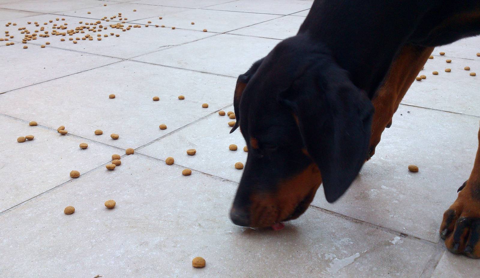 • Prueba a esparcir la comida por el suelo. Si no te gusta la idea, puedes hacerlo encima de un hule o incluso en el colchón del perro. Estoy pensando por supuesto en comida seca como el pienso o el hígado seco, pues con comida húmeda la tarea de limpieza, multiplicada por 4 ó 5 veces al día, sería árdua. Esparciendo la comida obligamos al perro a que pase más tiempo comiendo y no tenga la opción de meter el hocico entero en el cuenco de comida llevándose una gran cantidad de alimento, que debido a su ansiedad tragará sin masticar. Quizá al principio el perro esté desorientado con nuestra forma de darle la comida y quiera darse toda la prisa del mundo, pero pronto aprenderá que la comida no debe terminarse en 30 segundos, comenzará a masticar y comerá de forma más pausada, y mucho más sana, por cierto. Las alfombras de olfato, como el vídeo de arriba, son también una fantástica opción.